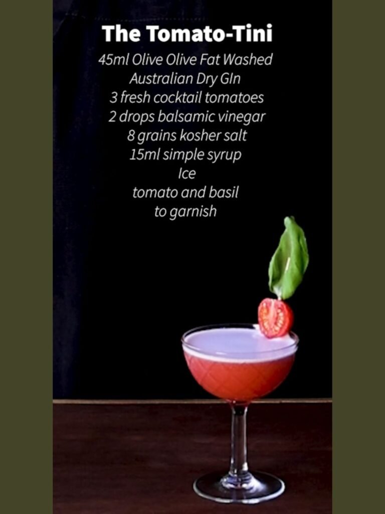 The Tomato-Tini is a playful exploration of savoury flavour. Built on our Australian Dry Gin, fat-washed with olive oil, it carries a soft, rounded texture that mirrors the richness of the fruit itself. Fresh, late harvest tomatoes bring sweetness, depth, and a sun-warmed intensity that can’t be replicated out of season. This is a cocktail shaped by time, by patience, and by the simple pleasure of things grown well.